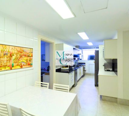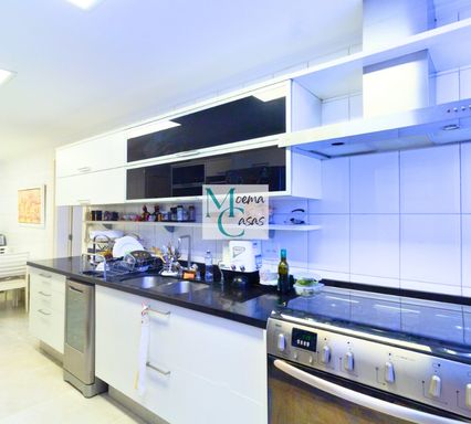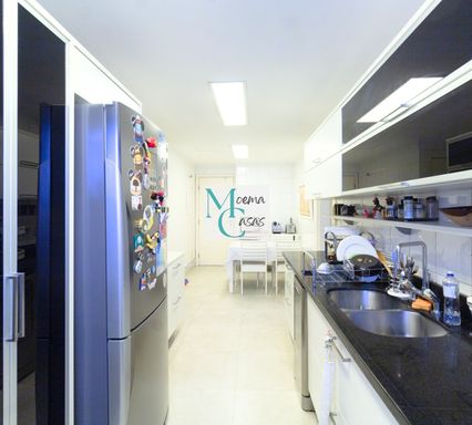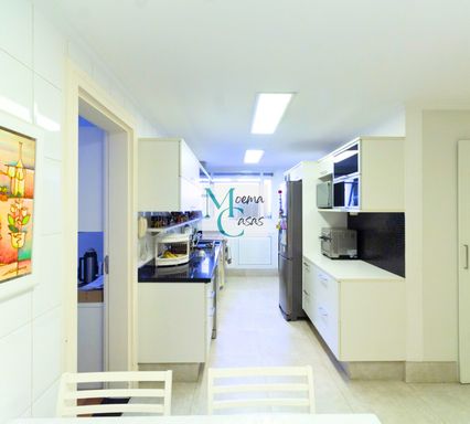 A cozinha é espaçosa, moderna e totalmente planejada, com armários de alta qualidade, integrada à área de serviço independente, que inclui dependência completa para funcionário.