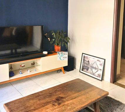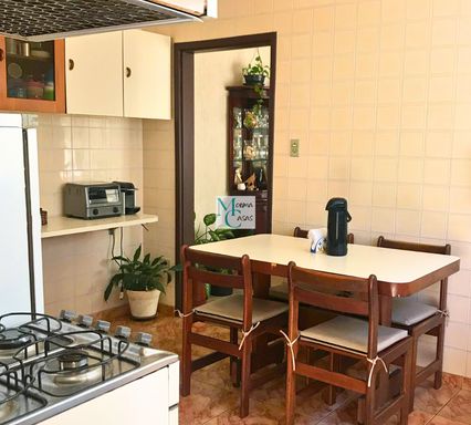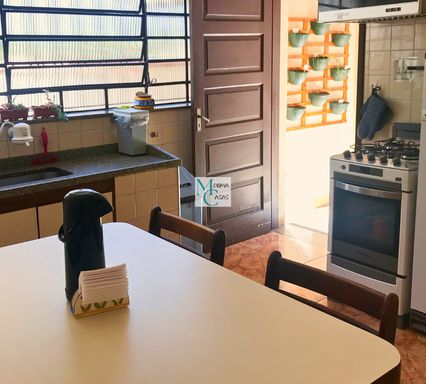 No térreo, o sobrado apresenta sala de estar com ar-condicionado, integrada à sala de jantar, A cozinha ampla facilita o dia a dia, com acesso ao delicioso quintal