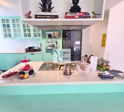 A cozinha americana complementa o conceito contemporâneo de convivência, aliando funcionalidade e sofisticação.