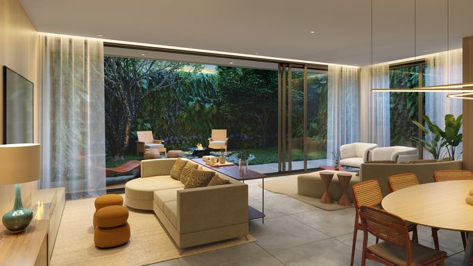 No pavimento térreo há jardim privativo, previsão para instalação de elevador, living com três ambientes, integração cozinha e sala de jantar com possibilidade de fechamento, lavabo, despensa, terraço coberto e entrada social.