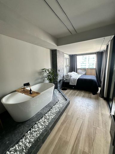 No piso superior, a área íntima é composta por: